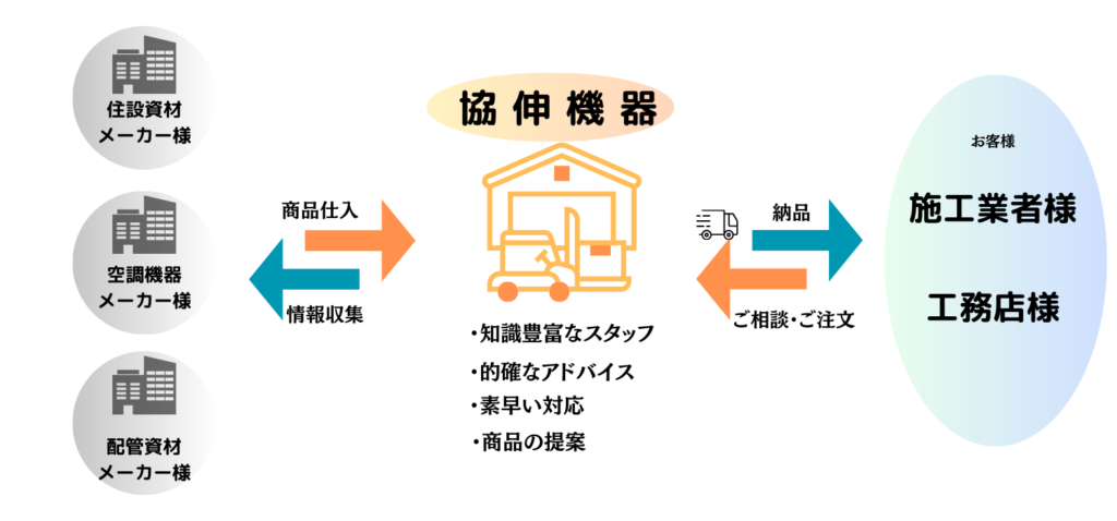 弊社は設立以来、住宅設備機器・配管資材を中心に メーカー様と地元の施工業者様・工務店様をつなぐ役割を担っております。 施工のプロフェッショナルなお客様を相手に、 「必要なものを・必要なときに」お届けできるよう、お客様のご期待に応えてまいります。